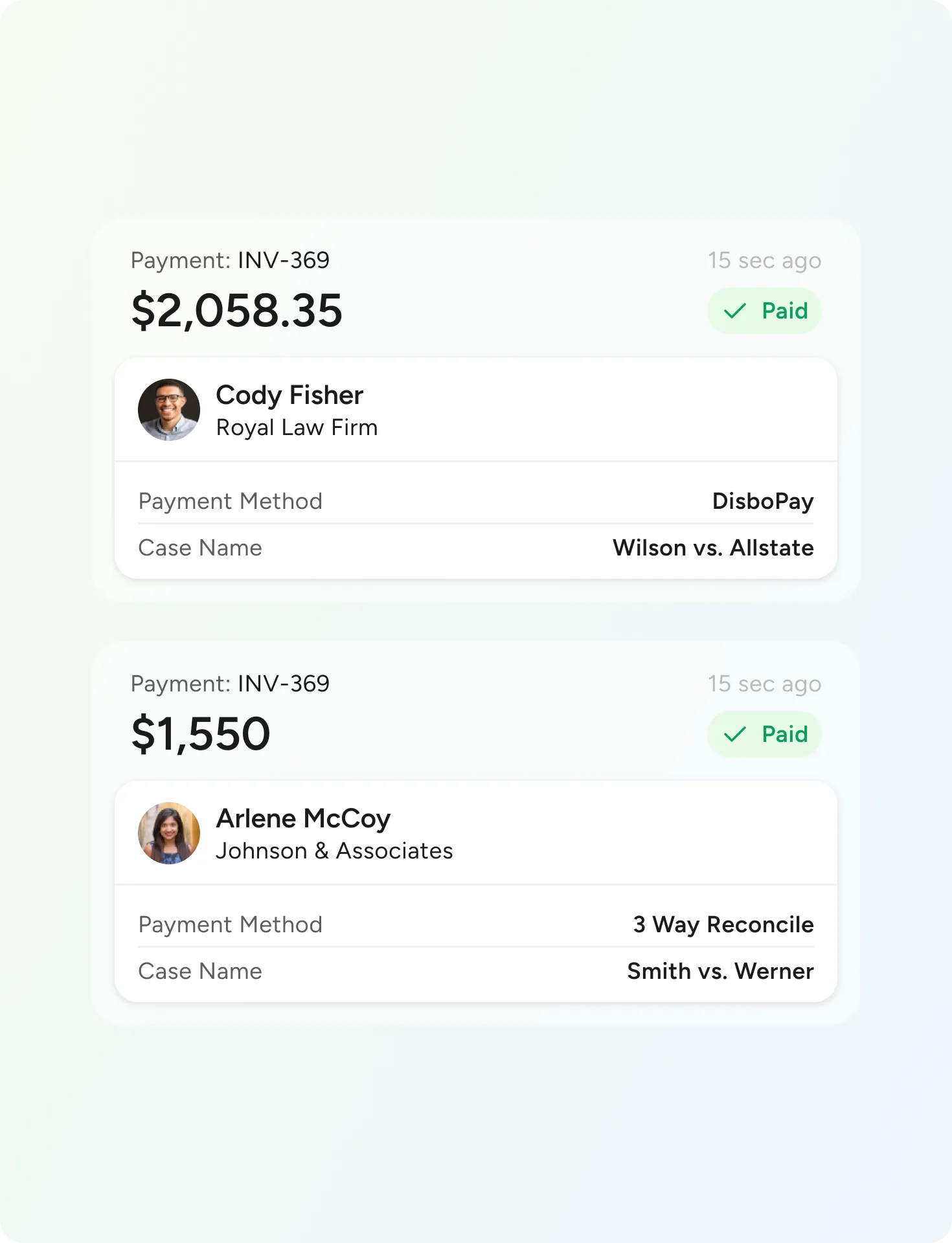 Disbo monitors every payment step with built-in safeguards that protect sensitive patient billing data. With secure digital payouts and automated document handling, your practice can work confidently with any law firm.